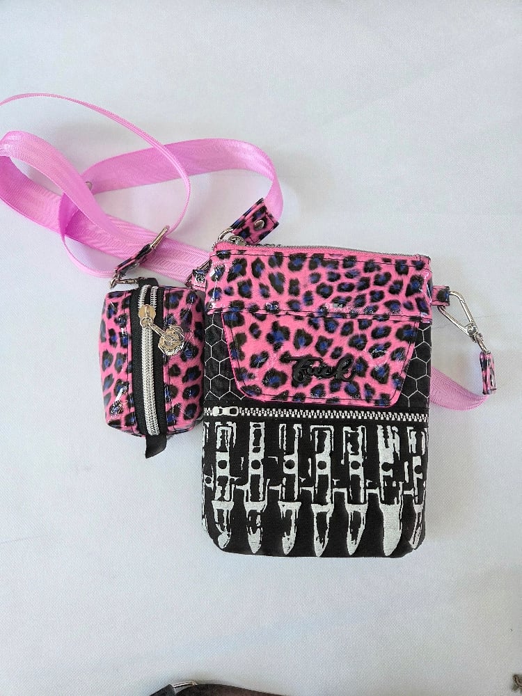 These phone sling bags are for the minimalists who don't like to carry big purses! Each sling bag can comfortably carry a phone, and other small items. To make each bag, I took a band patch and sewed it on some high-quality cotton fabric. I used bright leopard vinyl for the front pocket flap, which also features a middle finger clasp--once opened, you can place small items in this front pocket.