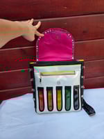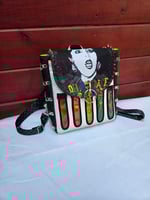 The front features the iconic test tubes with real liquid shakers! Lime green topstitching finishes off this one-of-a-kind bag. The insides are fully lined with bright pink and lime green fabric. Two zipper pockets and a slip pocket in the main panels. A slip pocket and another zipper pocket on the inside to stash the essentials. I added unique safety pin 🧷 and lightning bolt ⚡ zipper pulls.