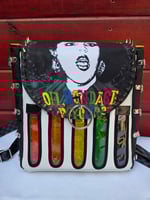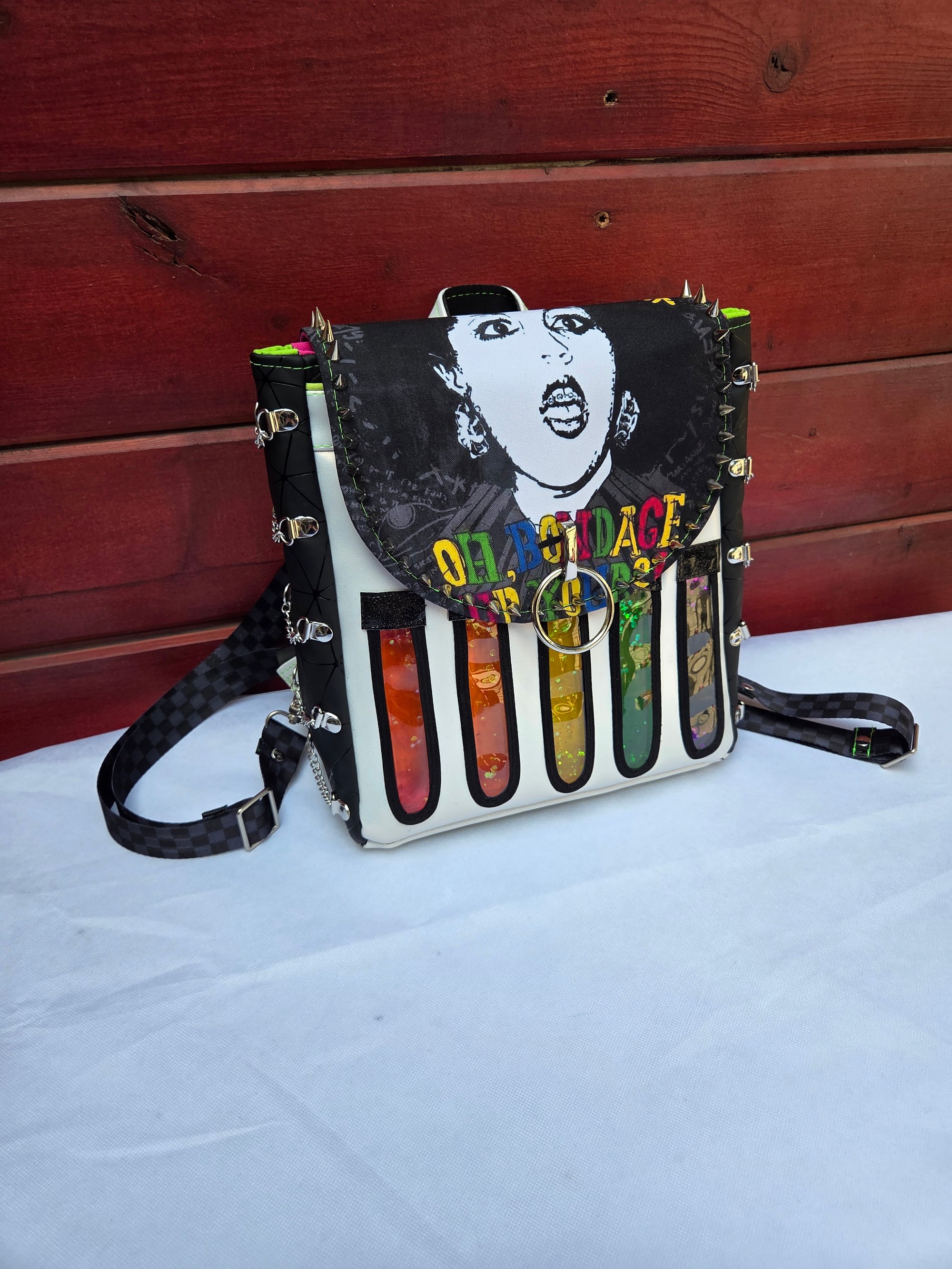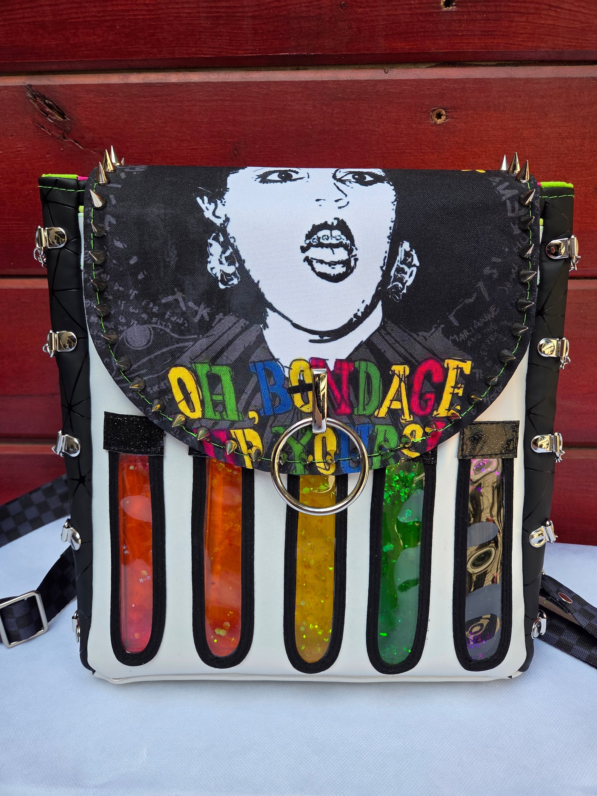 Made 100% from scratch! I took a custom X-ray Spex back patch with Poly Styrene and "oh bondage up yours!" lyric to make the flap for this mini backpack. I added screwback spike studs all around the border and a bondage ring.